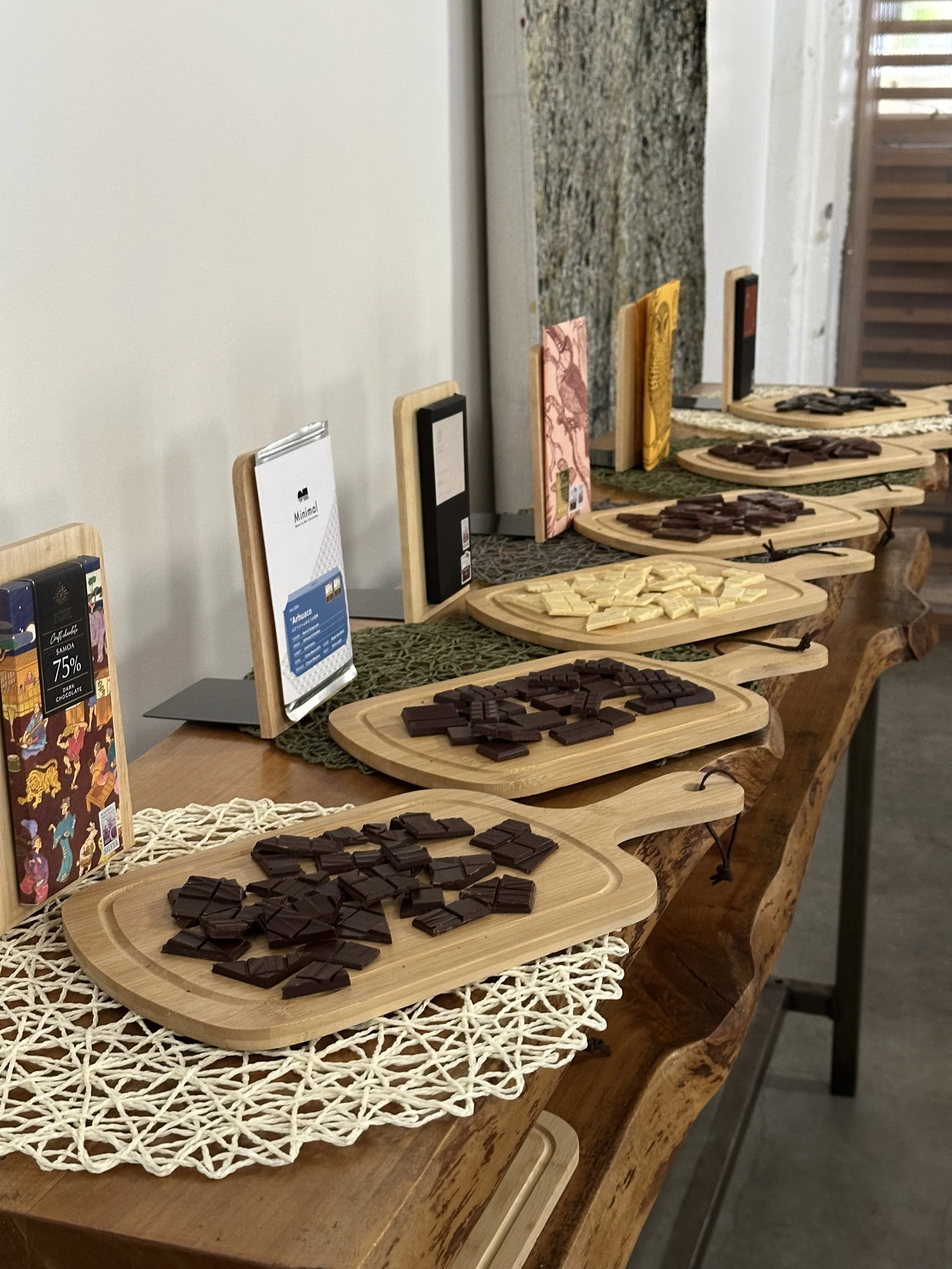 I come to you. I don't have a permanent tasting space, so I bring everything needed to your office, home, or venue. As long as everyone has a place to sit, all I need is space to display the chocolate.